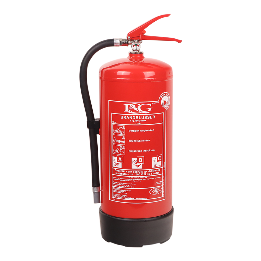 9 kg poeder brandblusser geschikt voor branden van klasse A (vaste stoffen), B (vloeistoffen) en C (gassen).