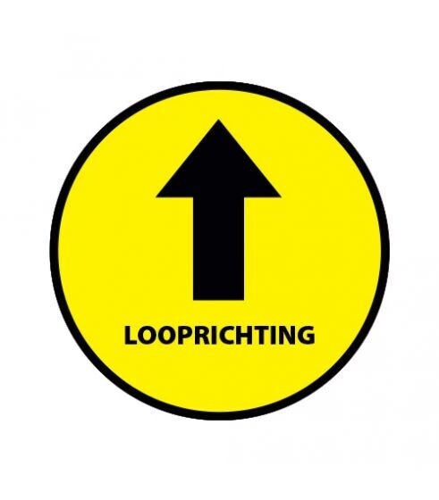 Vloersticker Pijl + tekst looprichting geel/zwart Ø 200 mm.