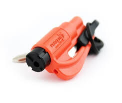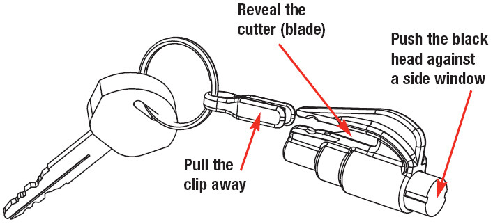 Deze zit bevestigd aan uw sleutels met een klik mechanisme. Wanneer de Res-Q-Me van de sleutelbos getrokken wordt zal het mesje direct vrijkomen, haak het mesje over de gordel en trek deze omlaag om de gordel door te snijden.
