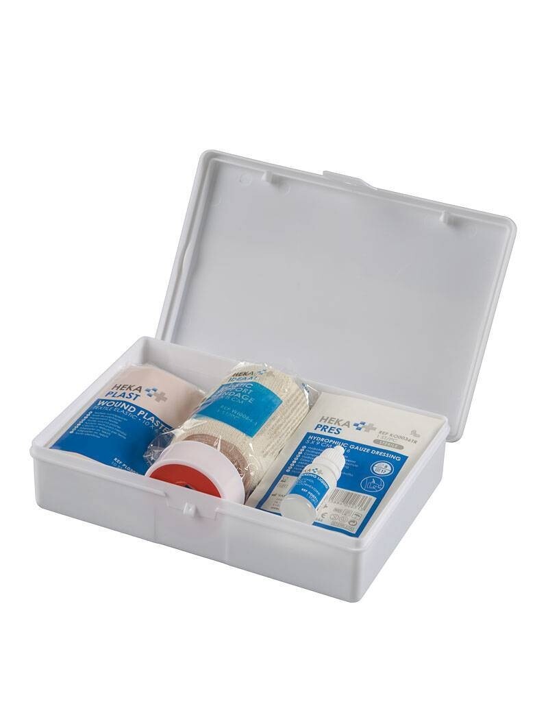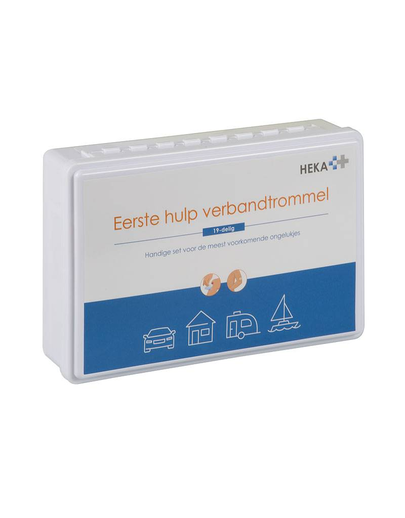 Een handzame verbanddoos die makkelijk opgeborgen kan worden in een keukenkastje, een dashbordkastje of in de caravan of boot.
