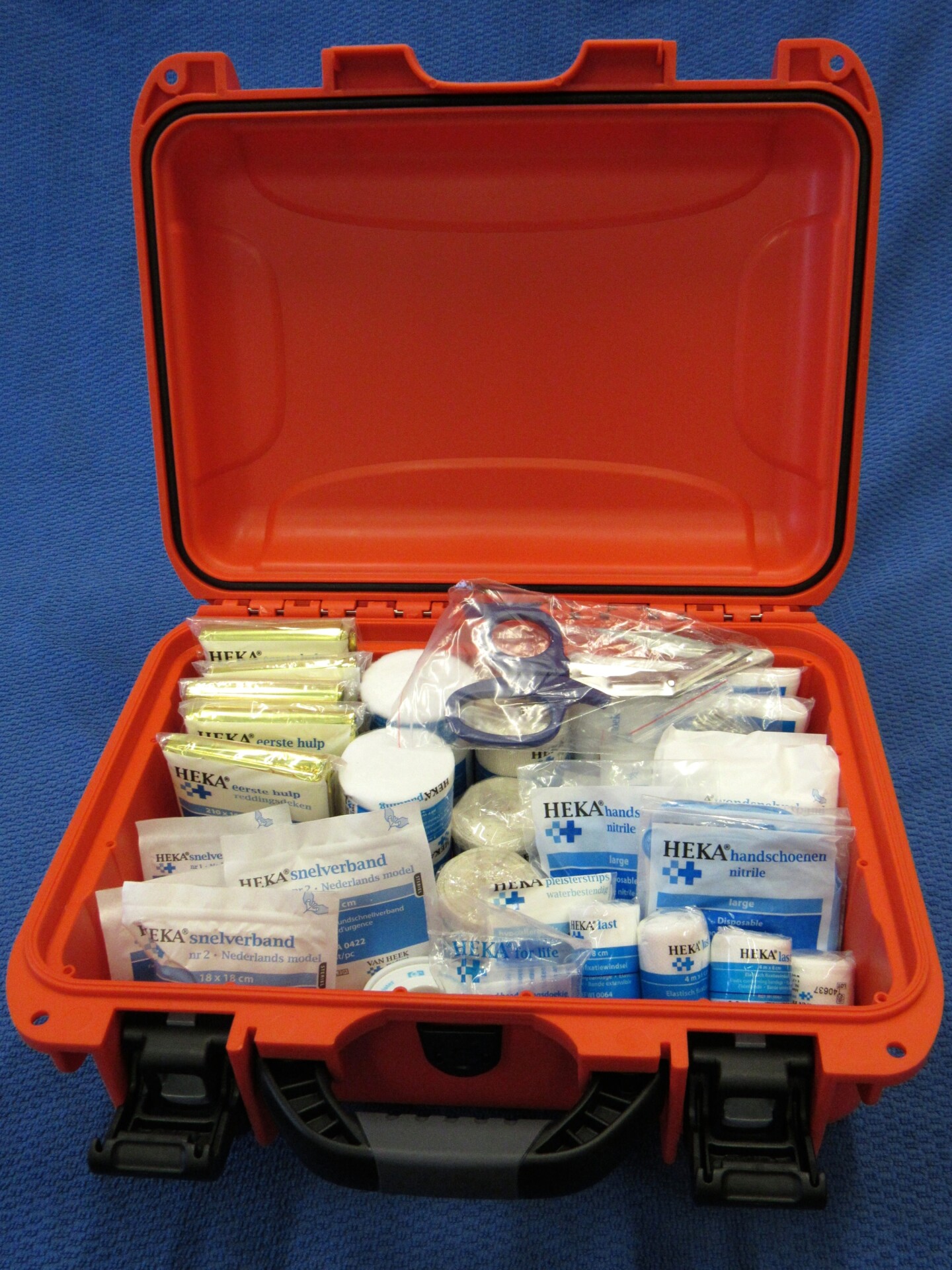 Waterproof verbandkoffer afgevuld met A-vulling en 5 extra reddingsdekens.