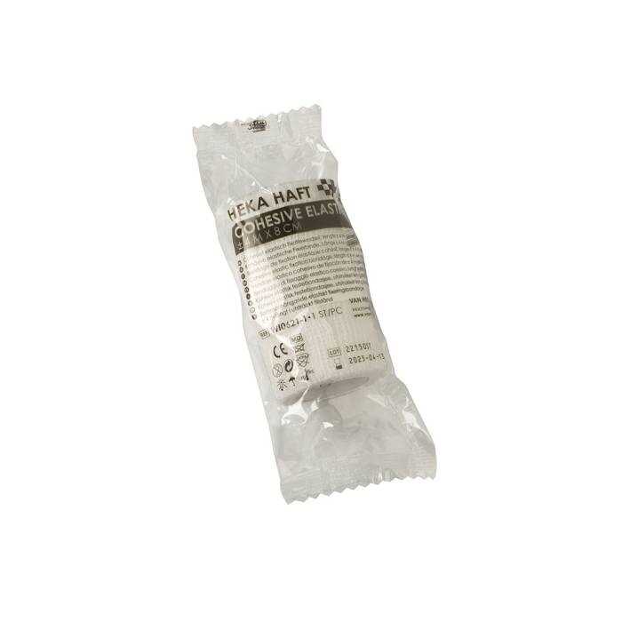 De Heka haft is een zelfklevend elastisch windsel en is gemaakt van 36% katoen, 36% viscose en 28% polyamide. Het windsel is absorberend, warmte- en luchtdoorlatend, huidvriendelijk en comfortabel te dragen. Dit latexvrije windsel kleeft aan zichzelf, niet aan huid en haar en heeft een middellange rek van 100%.